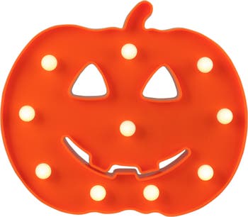 Add some light to your Halloween decor with this illuminated marquee sign. This orange jack o lantern and will be sure to send a chill down your spine, with its scary face. Great for Halloween parties or even use as a nightlight. Add this lighted jack o lantern to your Halloween collection. Product Features: Illuminated by 6 LED lights Color: white bulbs One-sided design LED lights use up to 80% less energy Bulbs stay cool to the touch Requires (2) AA size batteries; not included Convenient on/off switch on the back Comes ready-to-hang with keyhole hooks on the back Recommended for indoor decorative use only Dimensions: 6.5"H x 7.5"W x 1"D Material(s): plastic