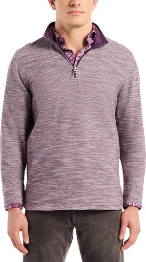 Space-dyed yarn creates the streaky stripes of this weekend-ready pullover that pops with just a hint of contrasting print inside the collar.