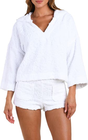 Lounge by the water feeling cozy in this terry cover-up hoodie featuring an ornate jacquard pattern.