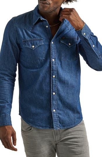 Cotton denim in a medium wash helps achieve a nuanced 'old west' feel on this pearly-snap shirt highlighted with angled yoke seams.