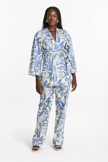 The timeless Leer Pants feature a flowing palazzo-style silhouette designed to flatter effortlessly. Deep side pockets and a soft, elasticized waistband offer the perfect balance of elegance and everyday ease.\nFeatured in TOILE BLU, this print is a modern ode to classic toile, reimagined through digital sketches and mirrored geometry. Oceanic blues echo the breeze and endless movement of the sea.