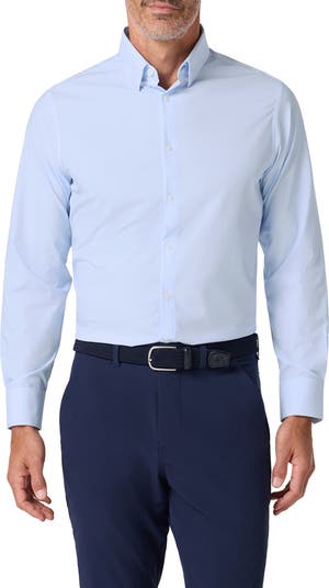 Stretchy, sweat-wicking fabric keeps you moving comfortably day and night in a shirt designed with a low hem that stays tucked when you want and looks great when you leave it out. The wrinkle-resistant finish makes it a crisp foundation for any casual-semiformal look.