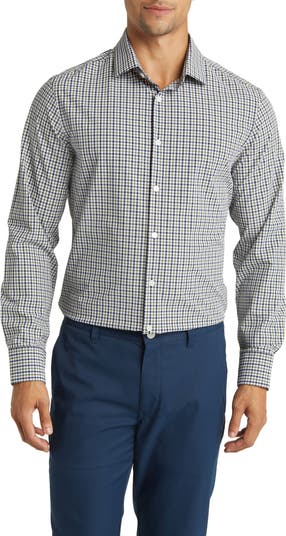 A classic gingham pattern covers a shirt made of stretchy, sweat-wicking fabric that resists wrinkles to keep you looking and feeling fresh.