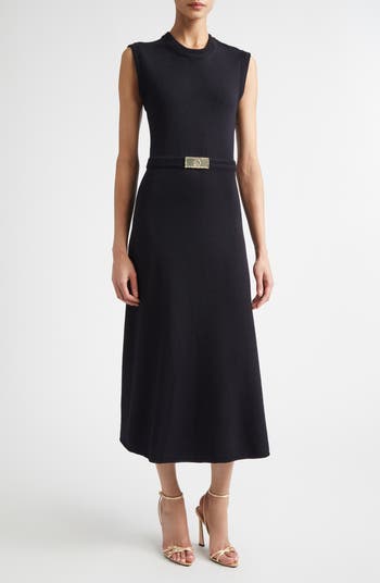 A textural herringbone stitch accents the crewneck, armholes and ingenious knit-in belt on this wool-blend sweater-dress fashioned from tightly spun crepe yarn.