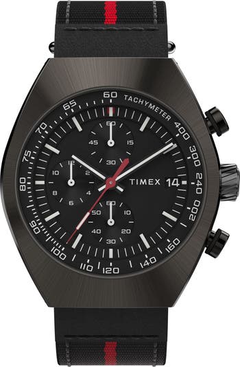 A heavy-duty case and durable canvas strap lend ultimate wearability to an analog-quartz chronograph finished with a nifty tachymeter and date window.