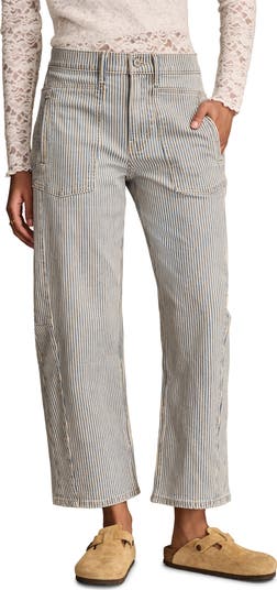 Railroad stripes enhance the ease of these low-stretch jeans cut in a curved barrel-leg silhouette.