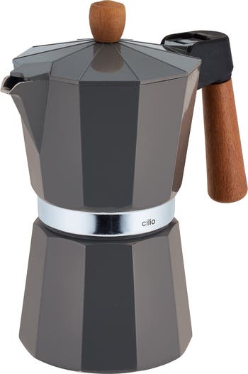 Experience authentic Italian espresso tradition at home with the Cilio Legno 15-Ounce Stovetop Espresso Maker. This classic moka pot is crafted from durable cast aluminum and features a signature natural wood handle that stays cool to the touch and adds a warm, artisanal look to any kitchen. Brewing is simple — fill the lower chamber with water, add finely ground espresso to the filter basket, screw the pot together, and heat on your gas or electric cooktop. In minutes, steam pressure forces hot water through the grounds and into the upper chamber, delivering up to 6 demitasse cups of bold, rich espresso without a machine, electricity, or pods. Designed by Cilio — a premium German kitchenware brand based in Solingen and long-time Frieling brand partner — the Legno is a timeless, no-fuss espresso solution for coffee lovers who appreciate quality craftsmanship and classic brewing tradition.