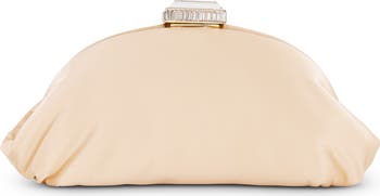Elevate your evening look with the classic style crafted from luxurious 100% silk, offering a smooth and sophisticated feel. The simple, yet elegant design is enhanced by gold-tone hardware and a removable gold chain, allowing for versatile carrying options. A large rectangular crystal knob adds a touch of glamour, while the clasp closure keeps your essentials secure.