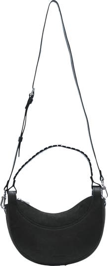 Supple suede and smooth leather create textural interplay on a crescent-shaped crossbody bag suspended from a pair of straps for on-the-go versatility.