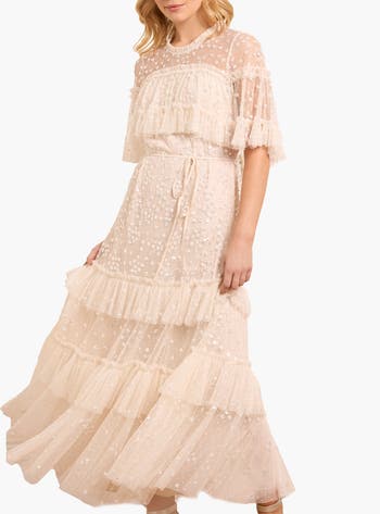 The Leila Dot Tiered Cape Ankle Gown features an integrated cape with gathered frills, adding a romantic touch. Crafted from signature Needle & Thread tulle, its loose-fitting silhouette offers an elegant, floaty look. Designed with a delicate fabric belt at the waist adds versatility. Beautifully embellished with shimmering clustered dot motifs and high-shine sequins, the gown is finished with signature tulle ruffles on the skirt and neckline. A truly captivating piece.