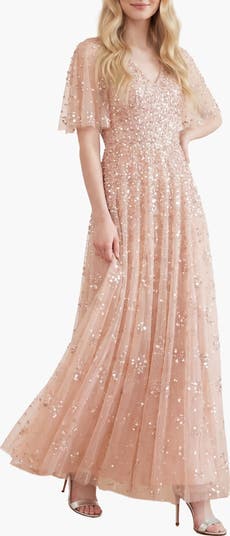 The Leila Dot V-Neck Cape Ankle Gown is embellished with shimmering clustered dot motifs for a sparkling effect. This elegant V-neck gown features slim sleeves and signature Needle & Thread tulle frills at the neckline and armholes. The skirt, crafted from layers of net and tulle, finishes with a sweeping hemline. A captivating design.