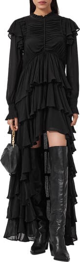 Rippled ruching enhances the texture of this romantic high/low maxi accented with floaty layered ruffles for fluttering movement.