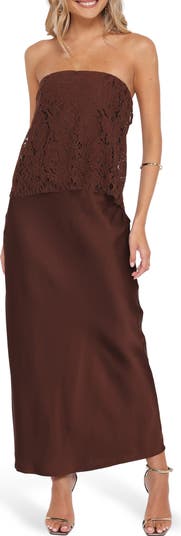 A fluttery lace overlay along the bodice brings textural dimension to this strapless maxi dress in a rich chocolate hue.