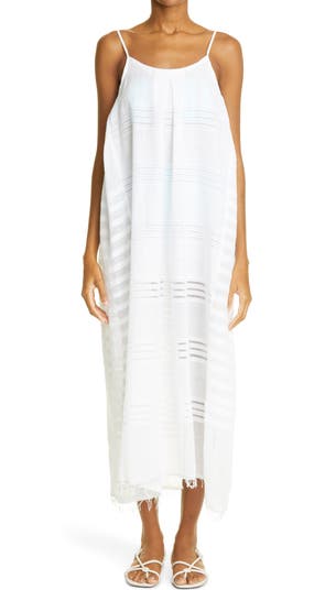 A breezy slipdress cover-up is cut from leno-striped fabric that's made in Ethiopia by artisans preserving the art of traditional hand weaving.