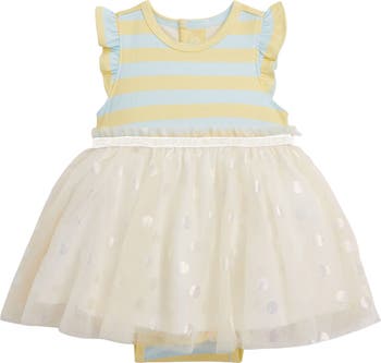 A tulle skirt with shimmery polka dots provides a perfect contrast to the two-tone stripes of this enchanting ruffle-sleeve dress.