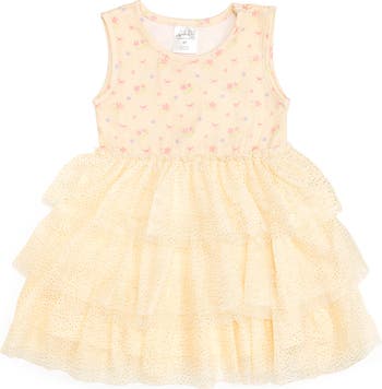 This darling dress combines a sweet, soft printed top with three dazzling layers of yellow tulle, making every twirl a magical moment.