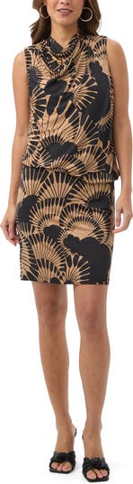 Printed jersey sheath dress with a cowl neck and drapey blouson waist