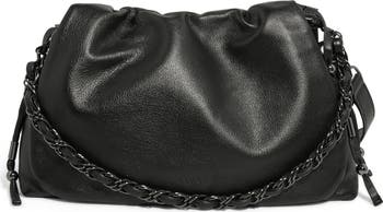 A slouchy and voluminous profile distinguish a roomy leather crossbody bag featuring multiple pockets and straps for on-the-go convenience and organization.