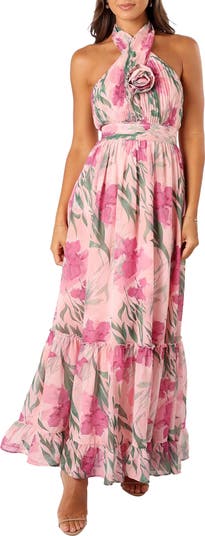 A romantic floral print covers this flowy woven gown designed with a breezy open back and pleated halter bodice complete with a rosette accent.