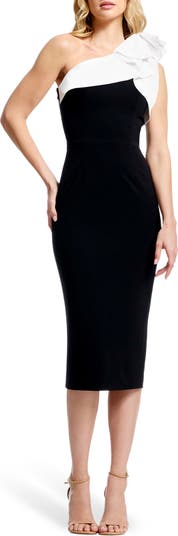 A sculptural flounce and architectural ruffle crown the one-shoulder neckline of this striking colorblocked cocktail dress. The body-con silhouette hugs the curves for a sleek, confident finish.