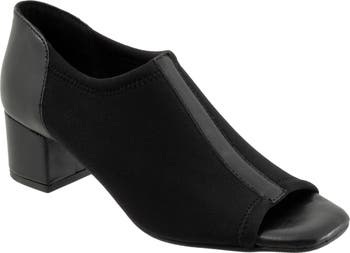 A contrasting leather-and-textile upper adds visual interest to this peep-toe block heel pump set on a cushioned footbed with supportive arch comfort.