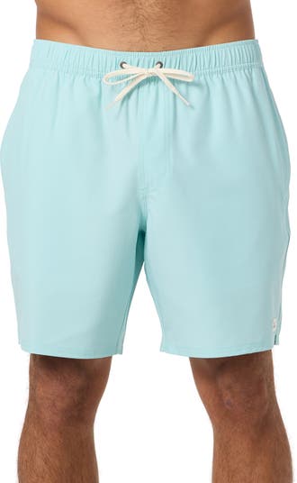 Durable, water-repellent fabric made in part with recycled plastic bottles keeps you comfortable in and out of the water in swim trunks designed with plenty of stretch and innovative antirash seams. They cinch above the hips and hit just above the knees in a roomy fit perfect for swimming, splashing or spiking volleyballs on the beach.