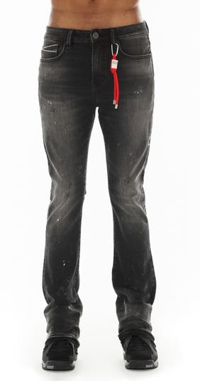 Allover paint splotches enhance the DIY look of these stretchy, faded bootcut jeans featuring a drawcord in front and stitching at the back leg that add signature details.