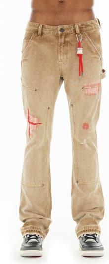 Bold contrast stitching and threadbare rips enhance the DIY look of these stretchy, faded bootcut jeans featuring a drawcord in front and tag at the back pocket for a signature flourish.