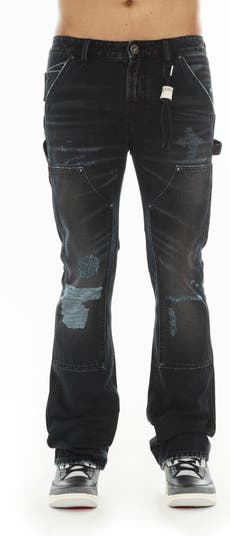 Repaired rips and articulated knees enhance the workwear, lived-in look of these bootcut jeans cut from faded, nonstretch denim.