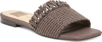 Fringe trim accentuates the woven raffia strap of this breezy slide sandal that's ready for the weekend.