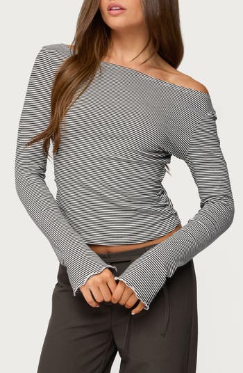 Show off your shoulders in this stretchy cotton top fashioned with charming stripes and long sleeves.