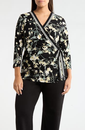 Walk through fresh blossoms everywhere you go in this fluttering wrap that that cinches comfortably at one hip.
