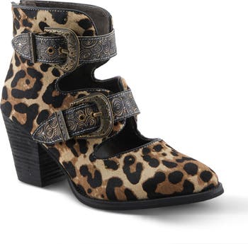 Leopard-spotted calf-hair and intricately detailed buckles play up the artistic style of this well-cushioned block-heel bootie.