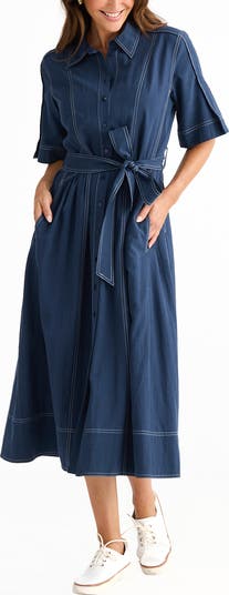 Contrast stitching in vertical stripes gives eye-catching dimension to this shirtdress cut to a versatile maxi length and defined at the waist with a tie belt.