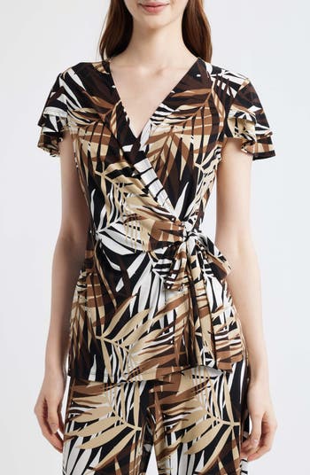 An allover tropical print enhances the vacation vibes of this wrapped flutter-sleeve top secured with a side tie to shape the silhouette.