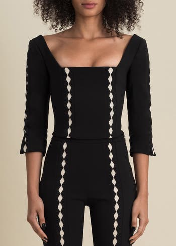 A structured yet fitted design, the Leo Top showcases the décolleté with elegance. Crafted from stretch fabric, soft lining peeks through diamond-shaped cutouts for added detail. Finished with a back zipper closure. Made in NYC.