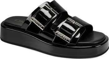 Polished buckles add instant sophistication to this sleek platform sandal complete with lightweight comfort cushioning.