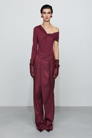 Overlap wide-leg pant in structured suiting with an asymmetric front panel and sharp pleats. Designed to sit at the true waist with side pockets for function. Pair it with the matching bodysuit—or mix in your own twist.