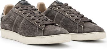 A snakeskin-embossed counter pops against the richly grained suede of a low-top sneaker designed with tasteful topstitching and a slanted logo stamped at the sidewall.