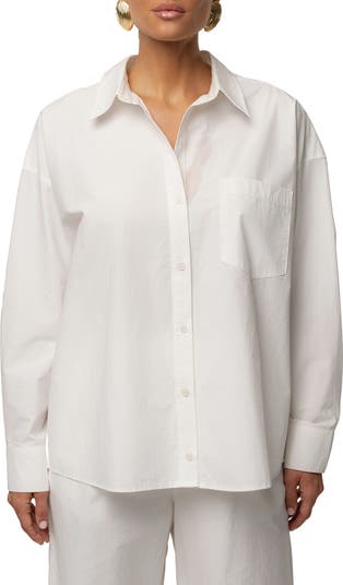 The clean aesthetic of crisp poplin contrasts with the comfortably oversized fit of this versatile button-up shirt with a single patch pocket.