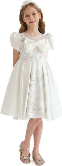 The Leona dress is an exquisite choice for any special occasion. This dress features a charming teacup puff shoulder design that adds a touch of vintage-inspired elegance. The large bows on the bodice and the back enhance the dress's sophisticated look, providing a striking and stylish accent. The split pleated skirt flows gracefully, perfect for twirling and dancing. The floral embroidery throughout the bodice and skirt adds intricate detail and a touch of luxurious charm.
