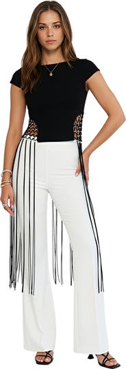 The Leona fringe top elevates casual wear with understated glamour. Crafted with a crew neck and short cape sleeves, this piece features a slim-fit silhouette and lined construction for comfort. The standout cage-detail waist is adorned with rhinestone-embellished fringe, adding a touch of sparkle and movement. Pair effortlessly with jeans, skirts, shorts, or Leona pants for a refined yet relaxed look that captures modern sophistication. Model wears size xs. Made in Turkey. Body knit:65-70% Viscose25-30% Nylon5% Elastane