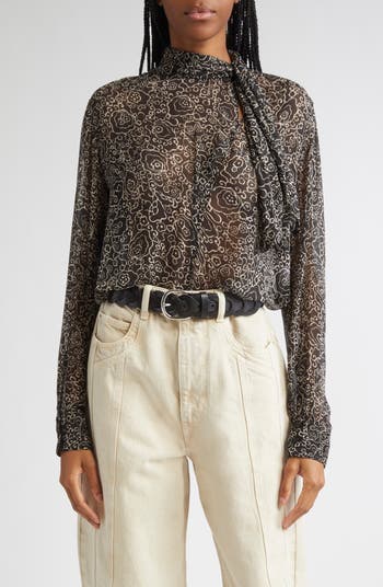 Balloon sleeves and elegant ties at the neck add eye-catching dimension to this flowy top made of airy material.