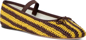 A delicate topline bow and bold stripe pattern highlight the woven raffia upper of a classic ballet flat secured with an elasticized mary jane strap for a customized fit.