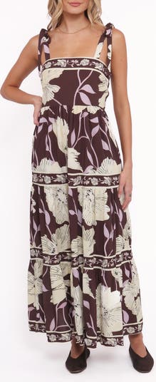 Dainty bows drape the shoulders of this light and lovely maxi covered in a flowery print and finished with a flouncy frilled hem.