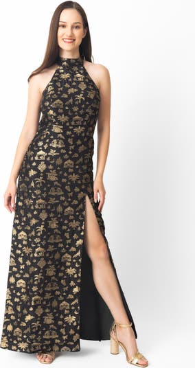 The Leontine Black and Gold Gown with Slit is crafted from luxurious silk brocade and features a rich black base adorned with elegant all-over golden patterns. The halter neck adds a touch of sophistication, while the front slit on the left leg brings a bold, graceful edge. Designed for those who embrace elegance with confidence, the Leontine Black and Gold Gown lets you rise in glory at any special occasion.