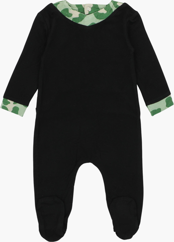 A stylish and comfortable baby outfit with a unique green leopard print on the collar and cuffs. Perfect for keeping your little one cozy.
