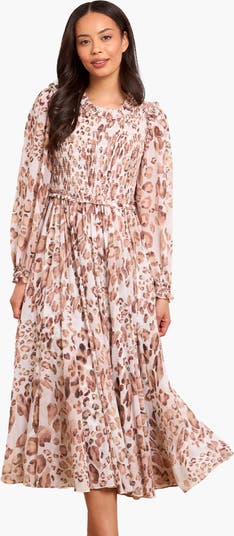 This stunning piece features a hand-painted leopard print, created in-house using watercolour techniques. The soft, fluid motifs vary in scale, with a beautifully watery definition. Crafted from the softest chiffon, it boasts a shirred bodice that is delicately adorned with signature Needle & Thread frills at the neckline, shoulders, and waist.