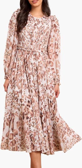 This stunning piece features a hand-painted leopard print, created in-house using watercolour techniques. The soft, fluid motifs vary in scale, with a beautifully watery definition. Crafted from the softest chiffon, it boasts a shirred bodice that is delicately adorned with signature Needle & Thread frills at the neckline, shoulders, and waist.