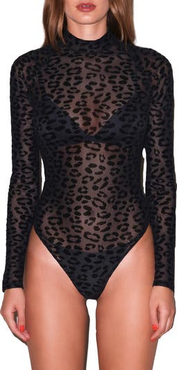 Leopard Flocked Long Sleeve Sheer Bodysuit